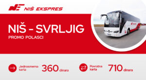Niš-Svrljig Promo cena Karta u jednom smeru 360 dinara, povratna karta 710 dinara. Informacije: AS Svrljig  065/466-9387 AS Niš       018/255-177