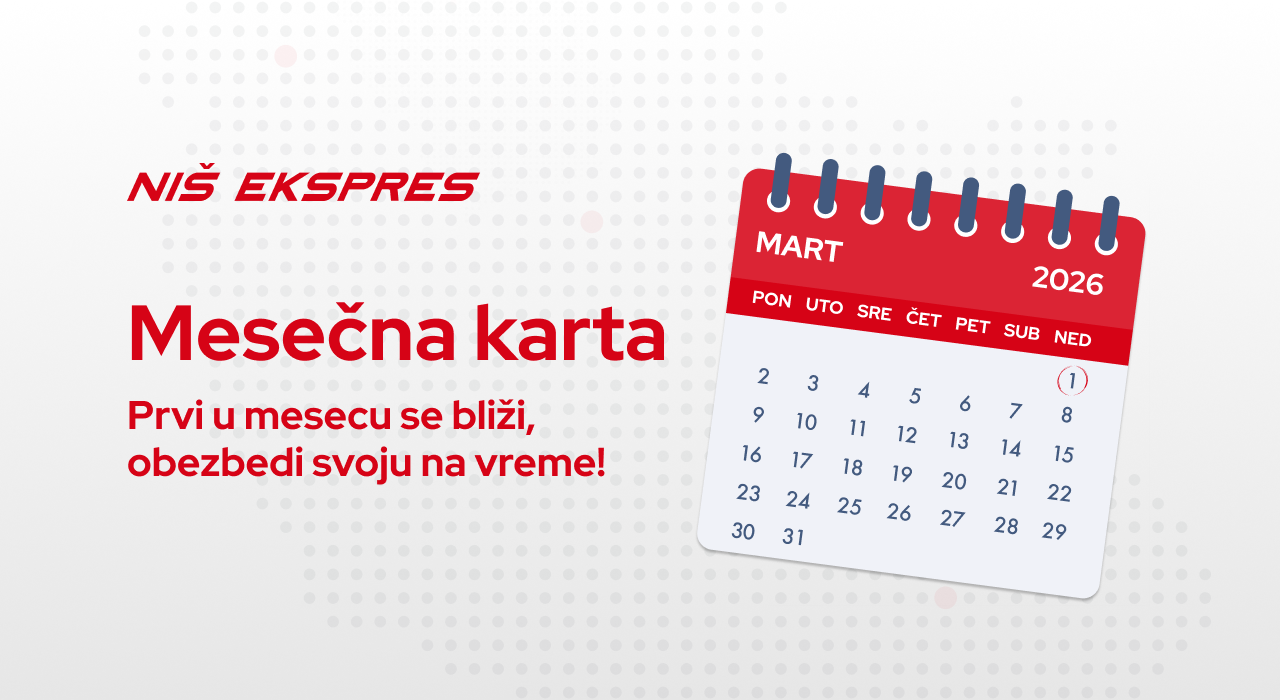 Prodaja mesečnih karata za MART 2026. godine počinje u utorak 24.02.2026. godine. Period važenja mesečne karte za mart 2026.godine je od 01.03 – 31.03.2026. godine.