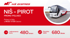 Niš-Pirot Promo cena na polascima iz Niša u 14:00 i 17:00 časova. Karta u jednom smeru 480 dinara, povratna karta 680 dinara. Informacije: Poslovnica Pirot