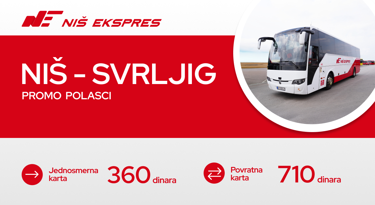 Niš-Pirot Promo cena na polascima iz Niša u 14:00 i 17:00 časova. Karta u jednom smeru 480 dinara, povratna karta 680 dinara. Informacije: Poslovnica Pirot