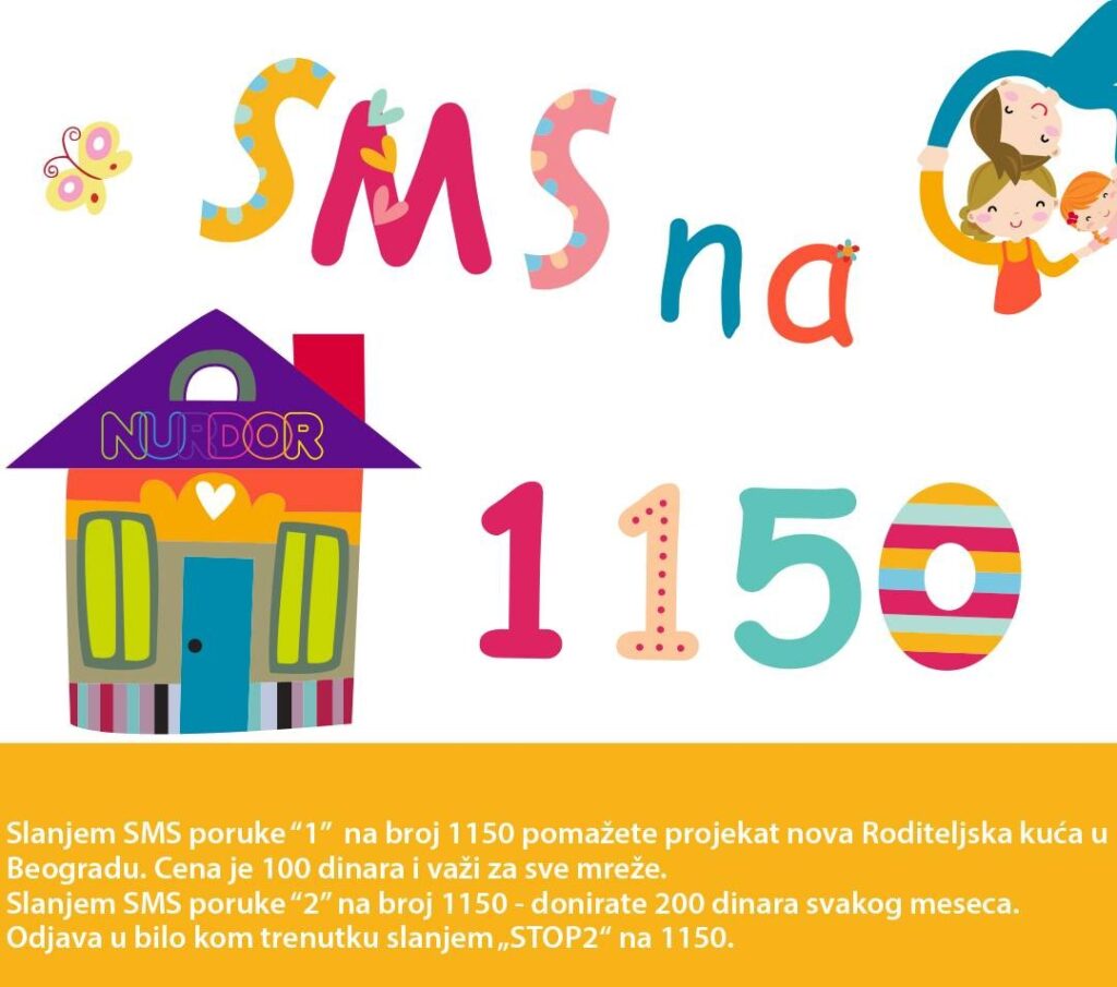 Slanjem SMS poruke „1“ na broj 1150 pomažete projekat nova Roditeljska kuća u Beogradu. Cena je 100 dinara i važi za sve mreže.